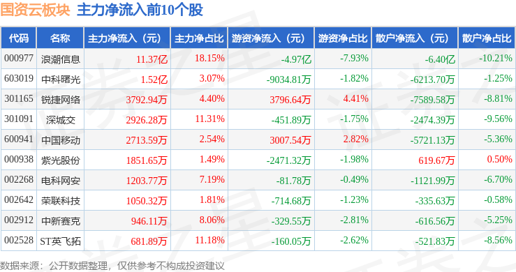 从资金流向上来看,当日国资云板块主力资金净流出1.11亿元,游资资金净流出4.47亿元,散户资金净流入5.58亿元。国资云板块个股资金流向见下表:
