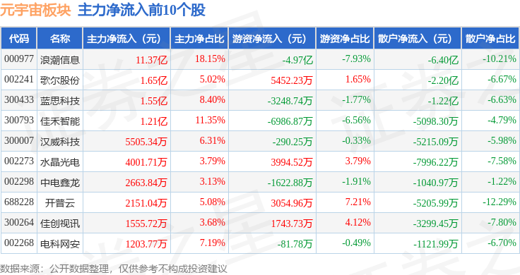 从资金流向上来看,当日元宇宙板块主力资金净流出32.62亿元,游资资金净流入1.22亿元,散户资金净流入31.4亿元。元宇宙板块个股资金流向见下表: