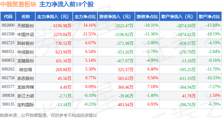 从资金流向上来看,当日中俄贸易板块主力资金净流入4440.25万元,游资资金净流出277.82万元,散户资金净流出4162.43万元。中俄贸易板块个股资金流向见下表: