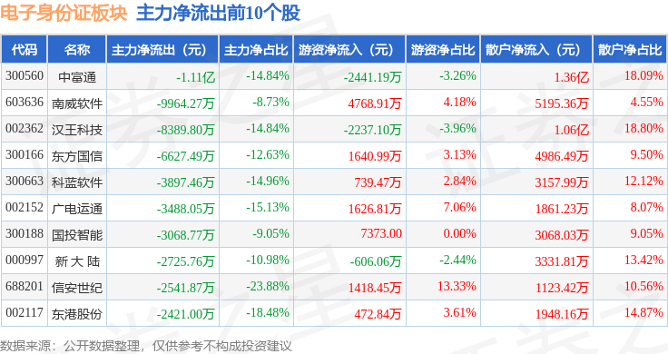 从资金流向上来看,当日电子身份证板块主力资金净流出6.8亿元,游资资金净流入4321.91万元,散户资金净流入6.37亿元。电子身份证板块个股资金流向见下表: