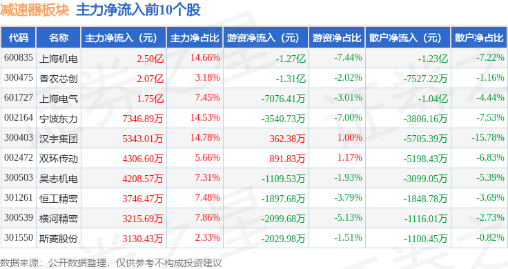 从资金流向上来看,当日减速器板块主力资金净流入7.32亿元,游资资金净流出4.26亿元,散户资金净流出3.05亿元。减速器板块个股资金流向见下表: