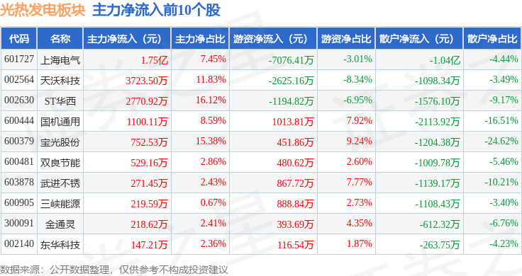 从资金流向上来看,当日光热发电板块主力资金净流出7036.98万元,游资资金净流出104.09万元,散户资金净流入7141.07万元。光热发电板块个股资金流向见下表: