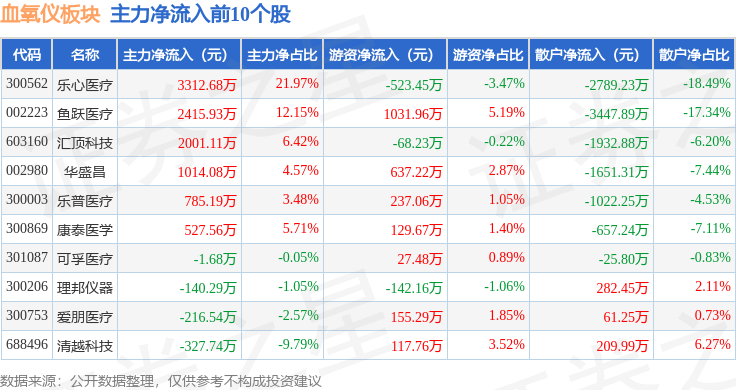 从资金流向上来看,当日血氧仪板块主力资金净流入3023.9万元,游资资金净流入2676.57万元,散户资金净流出5700.46万元。血氧仪板块个股资金流向见下表: