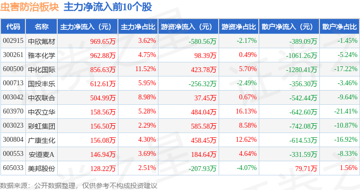 从资金流向上来看,当日虫害防治板块主力资金净流出1.32亿元,游资资金净流入1.28亿元,散户资金净流入428.12万元。虫害防治板块个股资金流向见下表: