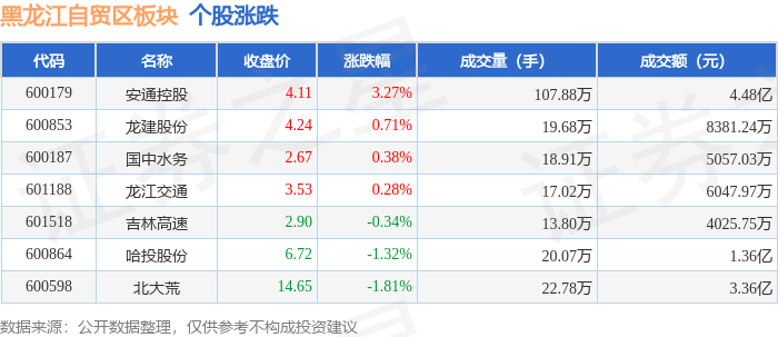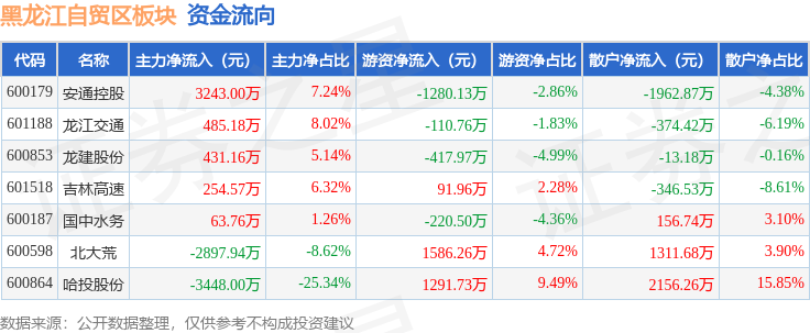 从资金流向上来看,当日黑龙江自贸区板块主力资金净流出1868.26万元,游资资金净流入940.58万元,散户资金净流入927.68万元。黑龙江自贸区板块个股资金流向见下表: