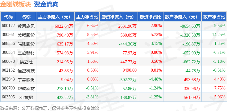 从资金流向上来看,当日金刚线板块主力资金净流入7590.74万元,游资资金净流入2549.99万元,散户资金净流出1.01亿元。金刚线板块个股资金流向见下表: