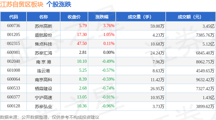 证券之星消息,11月26日江苏自贸区板块较上一交易日下跌0.35%,苏豪弘业领跌。当日上证指数报收于3864.18,下跌0.15%。深证成指报收于12907.83,上涨1.02%。江苏自贸区板块个股涨跌见下表: