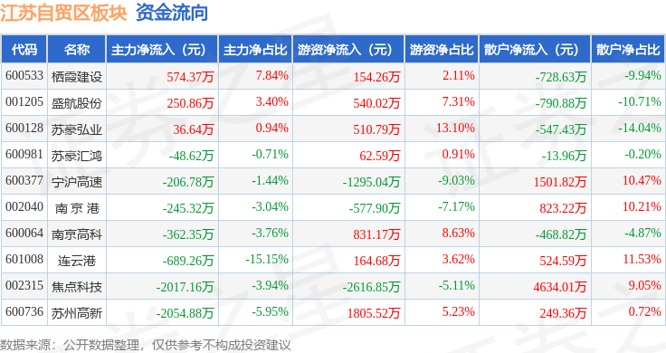 从资金流向上来看,当日江苏自贸区板块主力资金净流出4762.5万元,游资资金净流出420.77万元,散户资金净流入5183.27万元。江苏自贸区板块个股资金流向见下表: