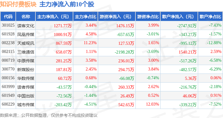 从资金流向上来看,当日知识付费板块主力资金净流出7.05亿元,游资资金净流出3582.49万元,散户资金净流入7.41亿元。知识付费板块个股资金流向见下表: