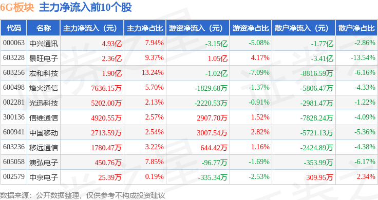 从资金流向上来看,当日6G板块主力资金净流出262.31万元,游资资金净流出1.93亿元,散户资金净流入1.96亿元。6G板块个股资金流向见下表: