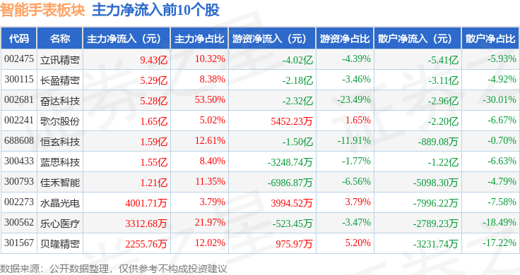 从资金流向上来看,当日智能手表板块主力资金净流入23.28亿元,游资资金净流出9.47亿元,散户资金净流出13.8亿元。智能手表板块个股资金流向见下表:
