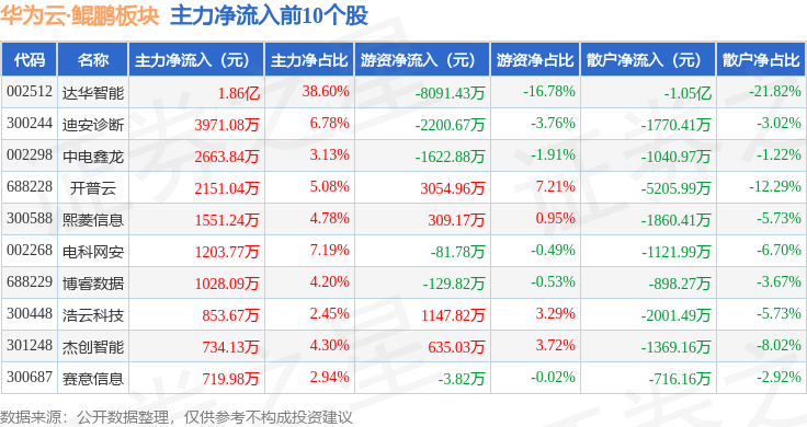 从资金流向上来看,当日华为云·鲲鹏板块主力资金净流出34.28亿元,游资资金净流入6935.38万元,散户资金净流入33.59亿元。华为云·鲲鹏板块个股资金流向见下表: