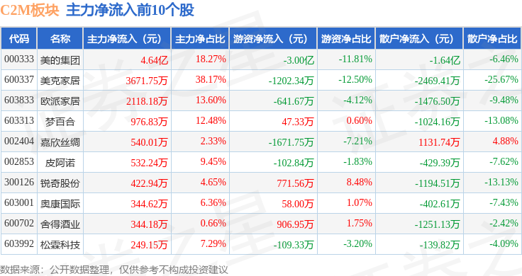 从资金流向上来看,当日C2M板块主力资金净流出2269.6万元,游资资金净流出2.66亿元,散户资金净流入2.89亿元。C2M板块个股资金流向见下表: