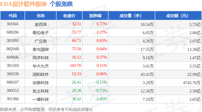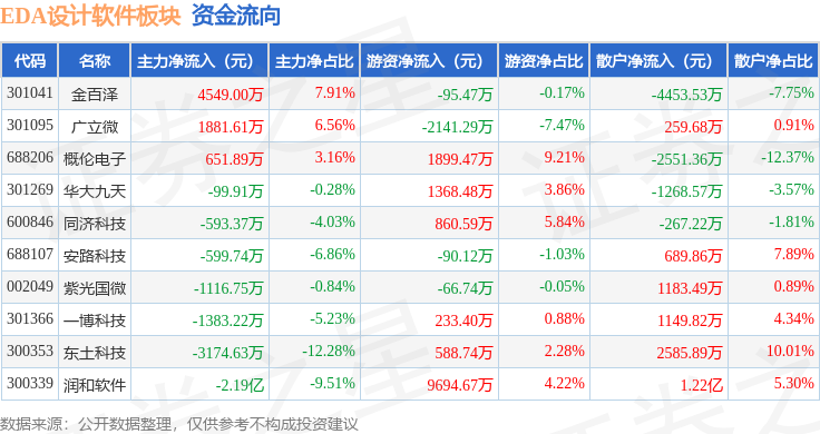从资金流向上来看,当日EDA设计软件板块主力资金净流出2.18亿元,游资资金净流入1.23亿元,散户资金净流入9503.53万元。EDA设计软件板块个股资金流向见下表: