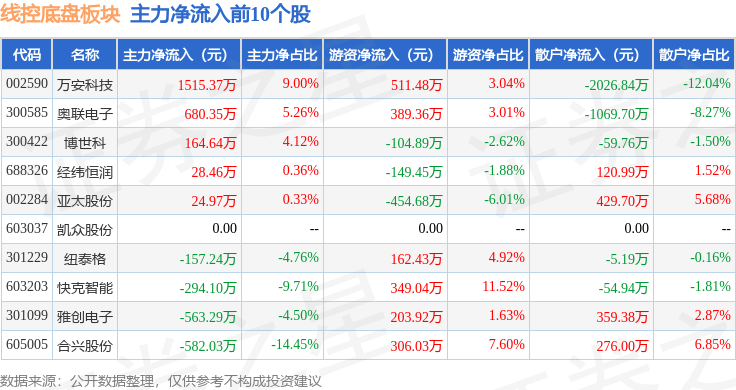 从资金流向上来看,当日线控底盘板块主力资金净流出2.07亿元,游资资金净流入999.3万元,散户资金净流入1.97亿元。线控底盘板块个股资金流向见下表: