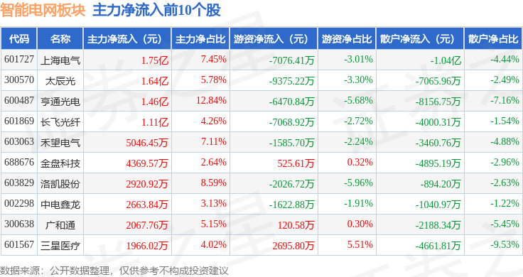 从资金流向上来看,当日智能电网板块主力资金净流出25.94亿元,游资资金净流入4.94亿元,散户资金净流入21.0亿元。智能电网板块个股资金流向见下表: