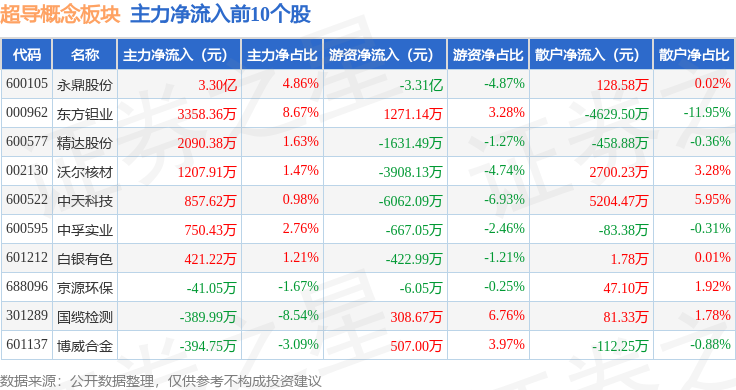 从资金流向上来看,当日超导概念板块主力资金净流入2.92亿元,游资资金净流出3.83亿元,散户资金净流入9102.71万元。超导概念板块个股资金流向见下表: