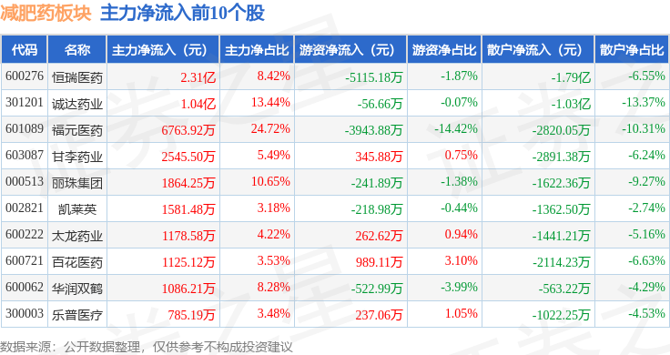 从资金流向上来看,当日减肥药板块主力资金净流入7320.94万元,游资资金净流出8305.42万元,散户资金净流入984.48万元。减肥药板块个股资金流向见下表:
