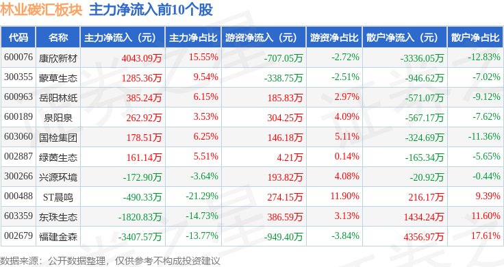从资金流向上来看,当日林业碳汇板块主力资金净流出7777.75万元,游资资金净流入2025.01万元,散户资金净流入5752.74万元。林业碳汇板块个股资金流向见下表: