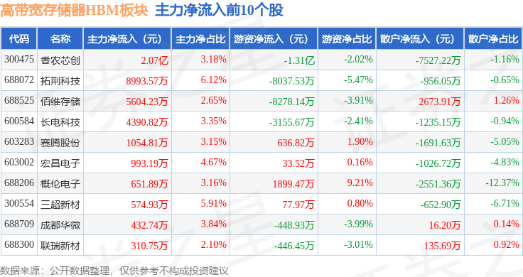 从资金流向上来看,当日高带宽存储器HBM板块主力资金净流出1.85亿元,游资资金净流出2.51亿元,散户资金净流入4.35亿元。高带宽存储器HBM板块个股资金流向见下表: