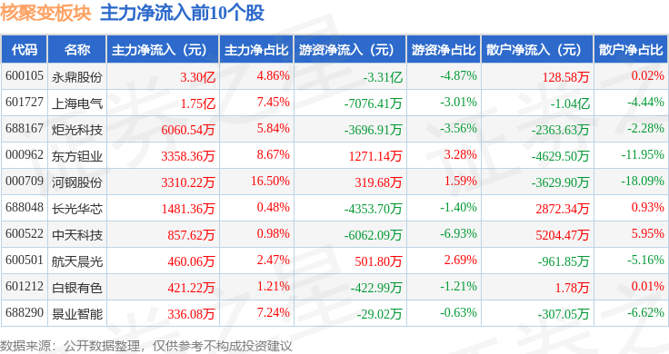 从资金流向上来看,当日核聚变板块主力资金净流出5.67亿元,游资资金净流出4.85亿元,散户资金净流入10.52亿元。核聚变板块个股资金流向见下表: