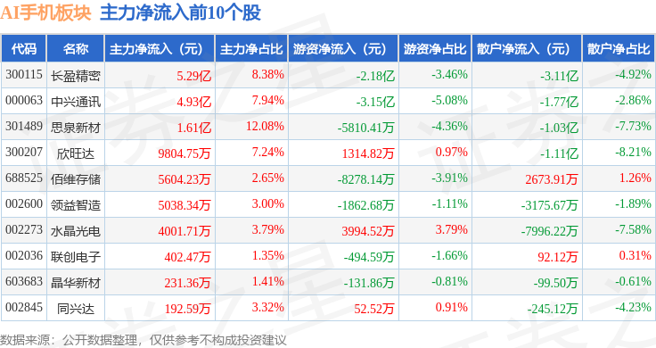 从资金流向上来看,当日AI手机板块主力资金净流入6.43亿元,游资资金净流出4.46亿元,散户资金净流出1.98亿元。AI手机板块个股资金流向见下表: