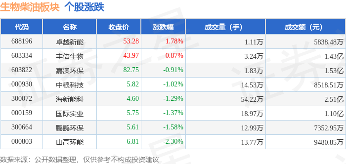 证券之星消息,11月26日生物柴油板块较上一交易日下跌0.79%,山高环能领跌。当日上证指数报收于3864.18,下跌0.15%。深证成指报收于12907.83,上涨1.02%。生物柴油板块个股涨跌见下表: