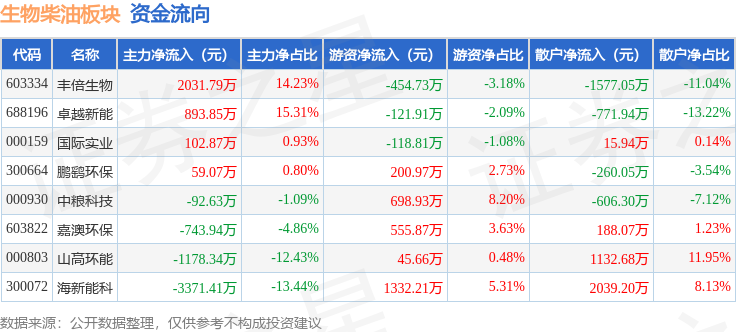 从资金流向上来看,当日生物柴油板块主力资金净流出2298.74万元,游资资金净流入2138.18万元,散户资金净流入160.56万元。生物柴油板块个股资金流向见下表: