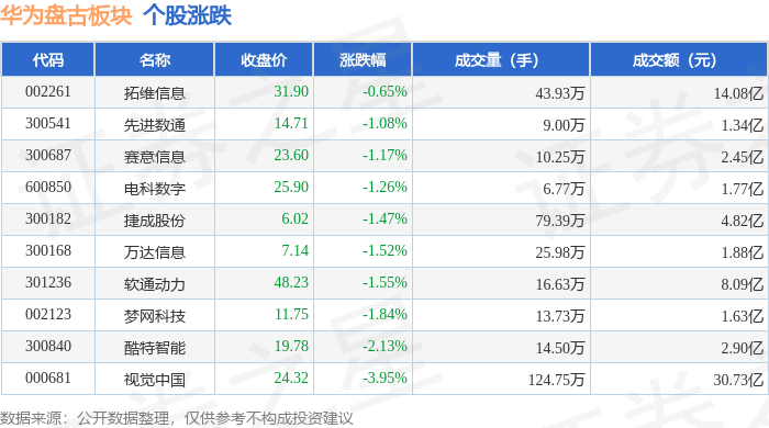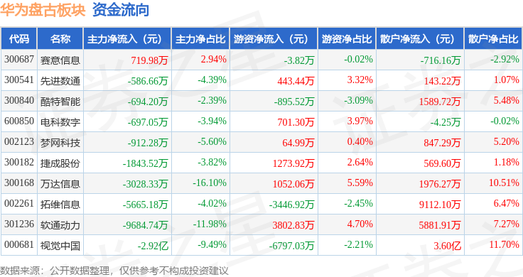从资金流向上来看,当日华为盘古板块主力资金净流出5.16亿元,游资资金净流出3804.75万元,散户资金净流入5.54亿元。华为盘古板块个股资金流向见下表: