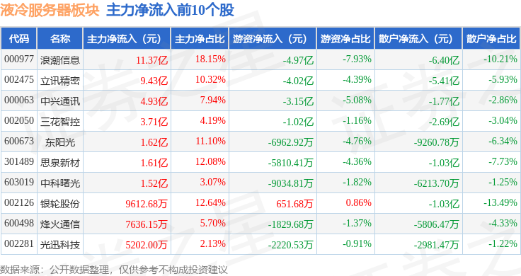 从资金流向上来看,当日液冷服务器板块主力资金净流入29.58亿元,游资资金净流出15.34亿元,散户资金净流出14.24亿元。液冷服务器板块个股资金流向见下表: