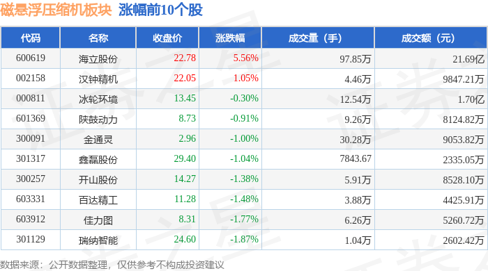 从资金流向上来看,当日磁悬浮压缩机板块主力资金净流出1.95亿元,游资资金净流出9565.71万元,散户资金净流入2.91亿元。磁悬浮压缩机板块个股资金流向见下表: