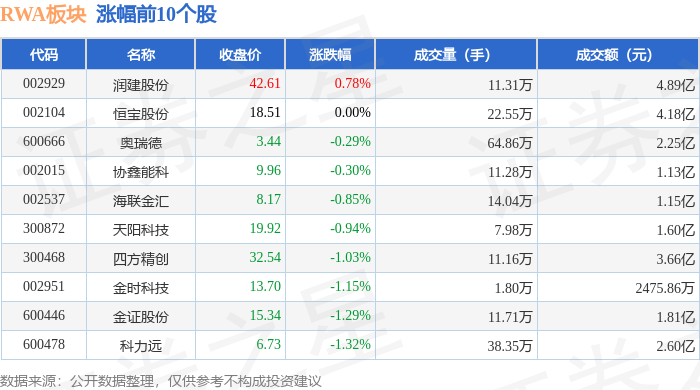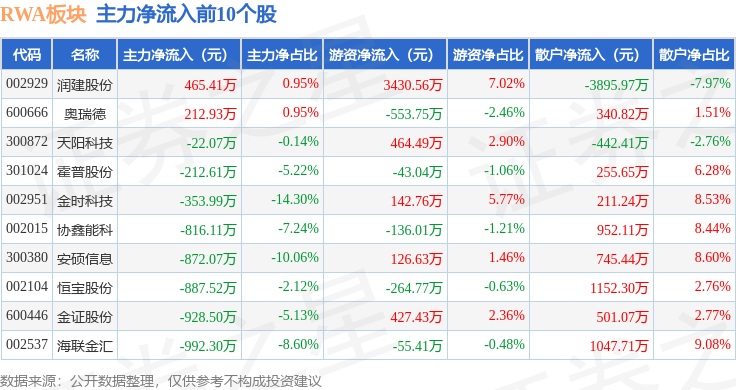 从资金流向上来看,当日RWA板块主力资金净流出1.86亿元,游资资金净流入8156.9万元,散户资金净流入1.04亿元。RWA板块个股资金流向见下表: