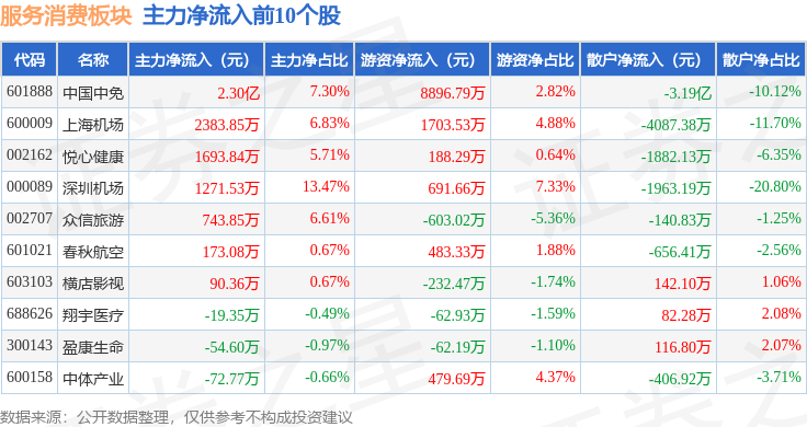 从资金流向上来看,当日服务消费板块主力资金净流出2.09亿元,游资资金净流入3.43亿元,散户资金净流出1.34亿元。服务消费板块个股资金流向见下表: