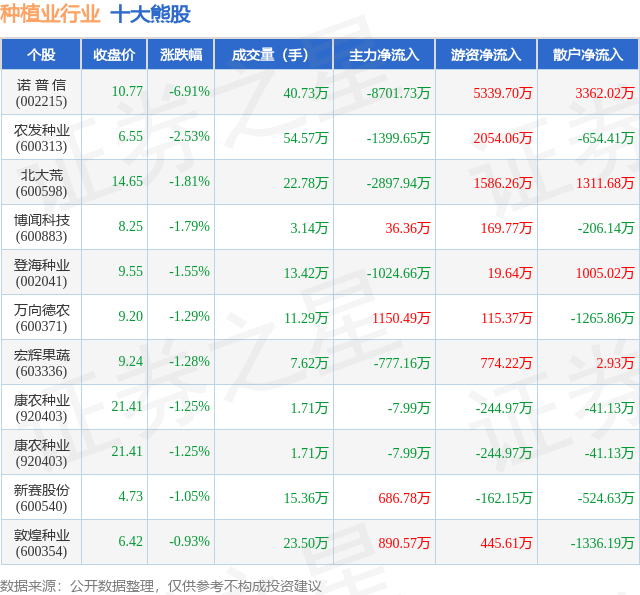 个股表现方面,种植业行业当日领跌股为诺 普 信(002215),该股当日报收10.77,下跌6.91%,成交量40.73万,主力资金净流出8701.73万元。农发种业(600313)以下跌2.53%紧随其后,该股当日成交量54.57万,主力资金净流出1399.65万元。除此之外,北大荒(600598)、博闻科技(600883)、登海种业(002041)均进入当日熊股之列。具体个股列表见下表: