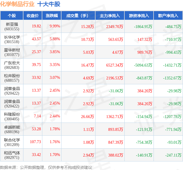个股表现方面,化学制品行业当日领涨股为新亚强(603155),该股当日报收19.82,上涨9.99%,成交量15.28万,主力资金净流入2349.7万元。长华化学(301518)以上涨5.88%紧随其后,该股当日成交量10.73万,主力资金净流入563.65万元。除此之外,星华新材(301077)、广东宏大(002683)、松井股份(688157)均进入当日牛股之列。具体个股列表见下表: