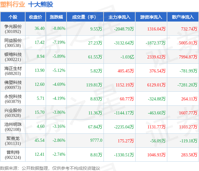 个股表现方面,塑料行业当日领跌股为争光股份(301092),该股当日报收36.4,下跌8.86%,成交量9.55万,主力资金净流出2048.79万元。同益股份(300538)以下跌7.19%紧随其后,该股当日成交量27.23万,主力资金净流出3132.64万元。除此之外,银禧科技(300221)、海正生材(688203)、佛塑科技(000973)均进入当日熊股之列。具体个股列表见下表: