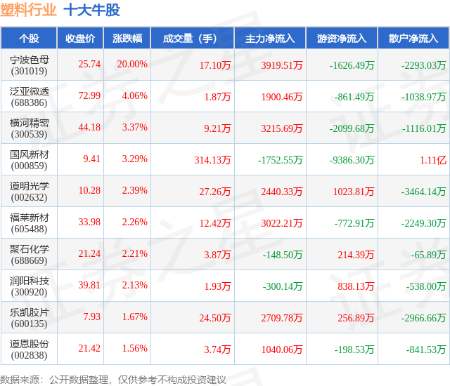 个股表现方面,塑料行业当日领涨股为宁波色母(301019),该股当日报收25.74,上涨20.0%,成交量17.1万,主力资金净流入3919.51万元。泛亚微透(688386)以上涨4.06%紧随其后,该股当日成交量1.87万,主力资金净流入1900.46万元。除此之外,横河精密(300539)、国风新材(000859)、道明光学(002632)均进入当日牛股之列。具体个股列表见下表: