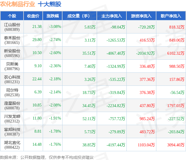 个股表现方面,农化制品行业当日领跌股为江山股份(600389),该股当日报收21.38,下跌3.08%,成交量5.83万,主力资金净流出98.04万元。泰禾股份(301665)以下跌2.74%紧随其后,该股当日成交量3.11万,主力资金净流出1265.53万元。除此之外,新安股份(600596)、贝斯美(300796)、农心科技(001231)均进入当日熊股之列。具体个股列表见下表: