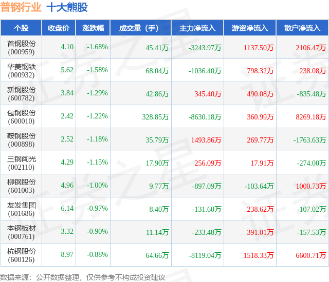 个股表现方面,普钢行业当日领跌股为首钢股份(000959),该股当日报收4.1,下跌1.68%,成交量45.41万,主力资金净流出3243.97万元。华菱钢铁(000932)以下跌1.58%紧随其后,该股当日成交量68.04万,主力资金净流出1036.4万元。除此之外,新钢股份(600782)、包钢股份(600010)、鞍钢股份(000898)均进入当日熊股之列。具体个股列表见下表: