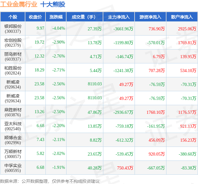 个股表现方面,工业金属行业当日领跌股为银邦股份(300337),该股当日报收9.97,下跌4.04%,成交量27.39万,主力资金净流出3661.96万元。宏创控股(002379)以下跌2.9%紧随其后,该股当日成交量13.78万,主力资金净流出1199.8万元。除此之外,丽岛新材(603937)、和胜股份(002824)、新威凌(920634)均进入当日熊股之列。具体个股列表见下表: