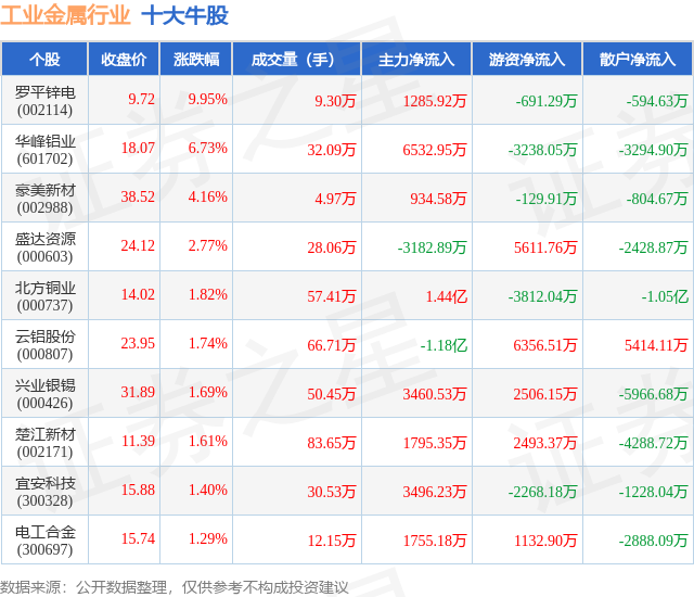 个股表现方面,工业金属行业当日领涨股为罗平锌电(002114),该股当日报收9.72,上涨9.95%,成交量9.3万,主力资金净流入1285.92万元。华峰铝业(601702)以上涨6.73%紧随其后,该股当日成交量32.09万,主力资金净流入6532.95万元。除此之外,豪美新材(002988)、盛达资源(000603)、北方铜业(000737)均进入当日牛股之列。具体个股列表见下表: