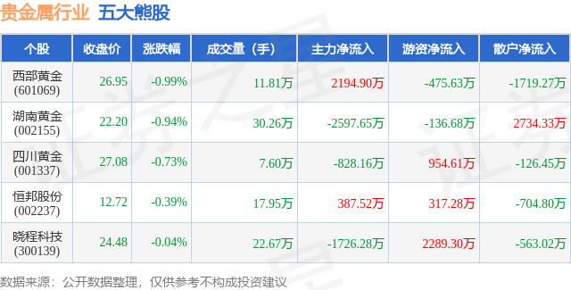 个股表现方面,贵金属行业当日领跌股为西部黄金(601069),该股当日报收26.95,下跌0.99%,成交量11.81万,主力资金净流入2194.9万元。湖南黄金(002155)以下跌0.94%紧随其后,该股当日成交量30.26万,主力资金净流出2597.65万元。除此之外,四川黄金(001337)、恒邦股份(002237)、晓程科技(300139)均进入当日熊股之列。具体个股列表见下表: