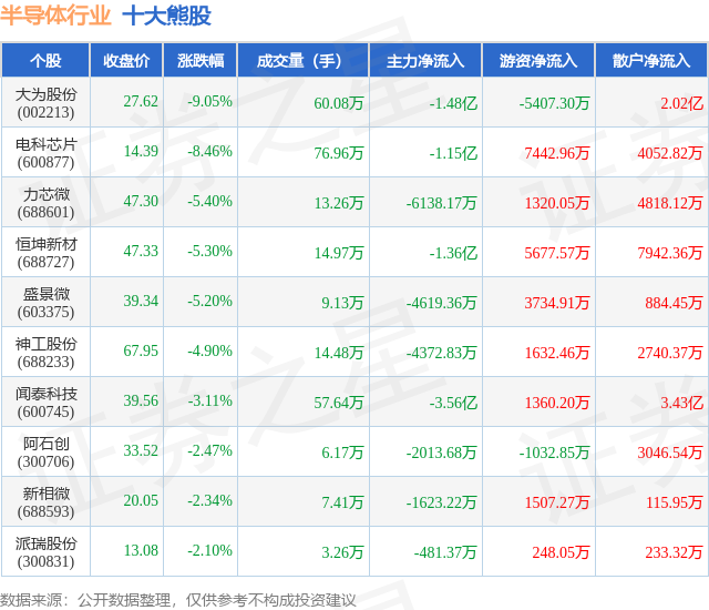 个股表现方面,半导体行业当日领跌股为大为股份(002213),该股当日报收27.62,下跌9.05%,成交量60.08万,主力资金净流出1.48亿元。电科芯片(600877)以下跌8.46%紧随其后,该股当日成交量76.96万,主力资金净流出1.15亿元。除此之外,力芯微(688601)、恒坤新材(688727)、盛景微(603375)均进入当日熊股之列。具体个股列表见下表: