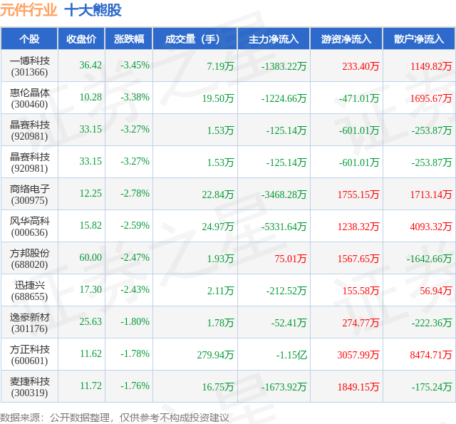 个股表现方面,元件行业当日领跌股为一博科技(301366),该股当日报收36.42,下跌3.45%,成交量7.19万,主力资金净流出1383.22万元。惠伦晶体(300460)以下跌3.38%紧随其后,该股当日成交量19.5万,主力资金净流出1224.66万元。除此之外,晶赛科技(920981)、晶赛科技(920981)、商络电子(300975)均进入当日熊股之列。具体个股列表见下表: