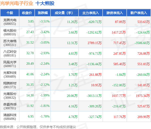 个股表现方面,光学光电子行业当日领跌股为龙腾光电(688055),该股当日报收3.85,下跌3.51%,成交量11.2万,主力资金净流出620.72万元。福光股份(688010)以下跌3.42%紧随其后,该股当日成交量3.66万,主力资金净流出1292.62万元。除此之外,苏大维格(300331)、八亿时空(688181)、凤凰光学(600071)均进入当日熊股之列。具体个股列表见下表: