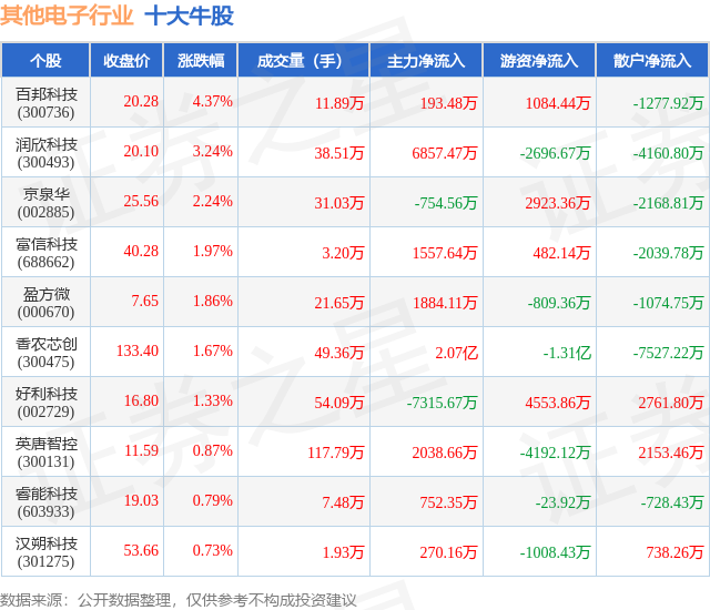 个股表现方面,其他电子行业当日领涨股为百邦科技(300736),该股当日报收20.28,上涨4.37%,成交量11.89万,主力资金净流入193.48万元。润欣科技(300493)以上涨3.24%紧随其后,该股当日成交量38.51万,主力资金净流入6857.47万元。除此之外,京泉华(002885)、富信科技(688662)、盈方微(000670)均进入当日牛股之列。具体个股列表见下表:
