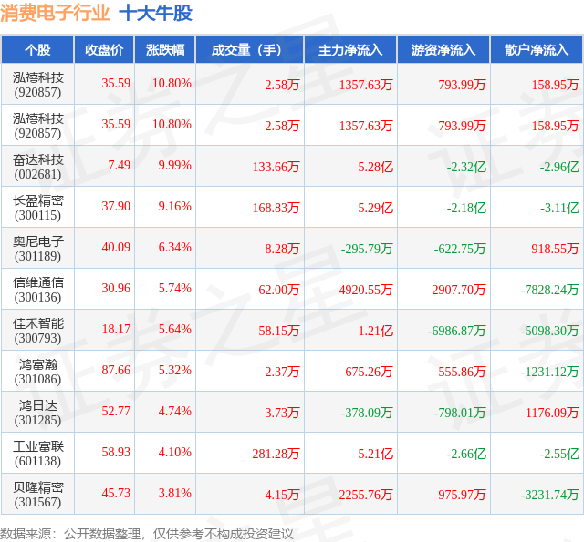 个股表现方面,消费电子行业当日领涨股为泓禧科技(920857),该股当日报收35.59,上涨10.8%,成交量2.58万,主力资金净流入1357.63万元。泓禧科技(920857)以上涨10.8%紧随其后,该股当日成交量2.58万,主力资金净流入1357.63万元。除此之外,奋达科技(002681)、长盈精密(300115)、奥尼电子(301189)均进入当日牛股之列。具体个股列表见下表: