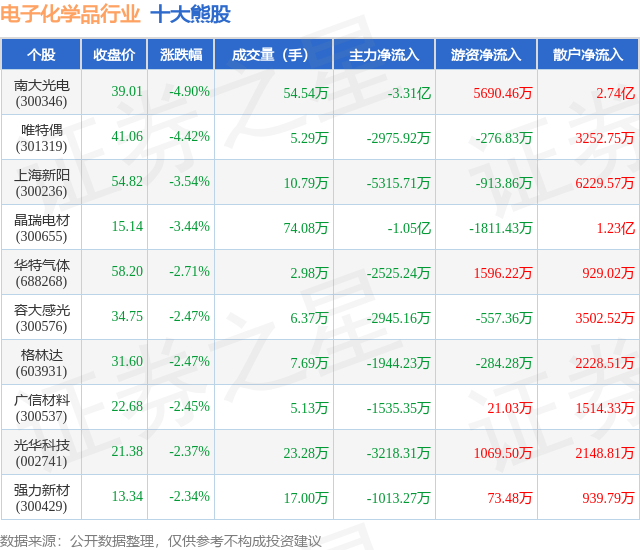 个股表现方面,电子化学品行业当日领跌股为南大光电(300346),该股当日报收39.01,下跌4.9%,成交量54.54万,主力资金净流出3.31亿元。唯特偶(301319)以下跌4.42%紧随其后,该股当日成交量5.29万,主力资金净流出2975.92万元。除此之外,上海新阳(300236)、晶瑞电材(300655)、华特气体(688268)均进入当日熊股之列。具体个股列表见下表: