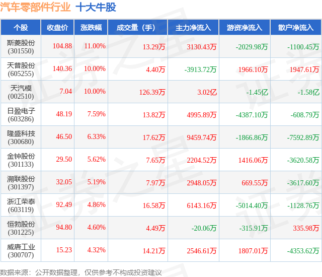 个股表现方面,汽车零部件行业当日领涨股为斯菱股份(301550),该股当日报收104.88,上涨11.0%,成交量13.29万,主力资金净流入3130.43万元。天普股份(605255)以上涨10.0%紧随其后,该股当日成交量4.4万,主力资金净流出3913.72万元。除此之外,天汽模(002510)、日盈电子(603286)、隆盛科技(300680)均进入当日牛股之列。具体个股列表见下表: