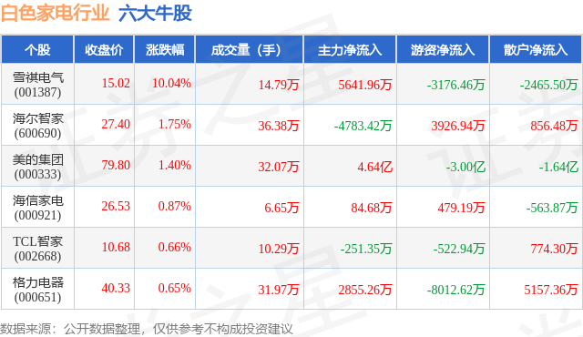 个股表现方面,白色家电行业当日领涨股为雪祺电气(001387),该股当日报收15.02,上涨10.04%,成交量14.79万,主力资金净流入5641.96万元。海尔智家(600690)以上涨1.75%紧随其后,该股当日成交量36.38万,主力资金净流出4783.42万元。除此之外,美的集团(000333)、海信家电(000921)、TCL智家(002668)均进入当日牛股之列。具体个股列表见下表: